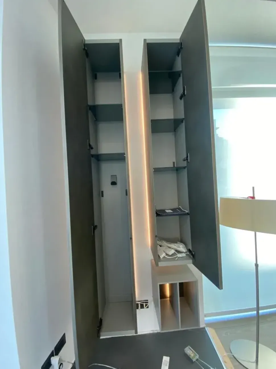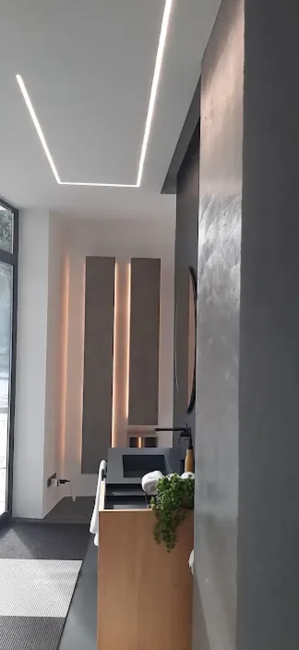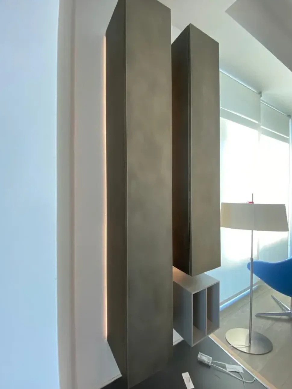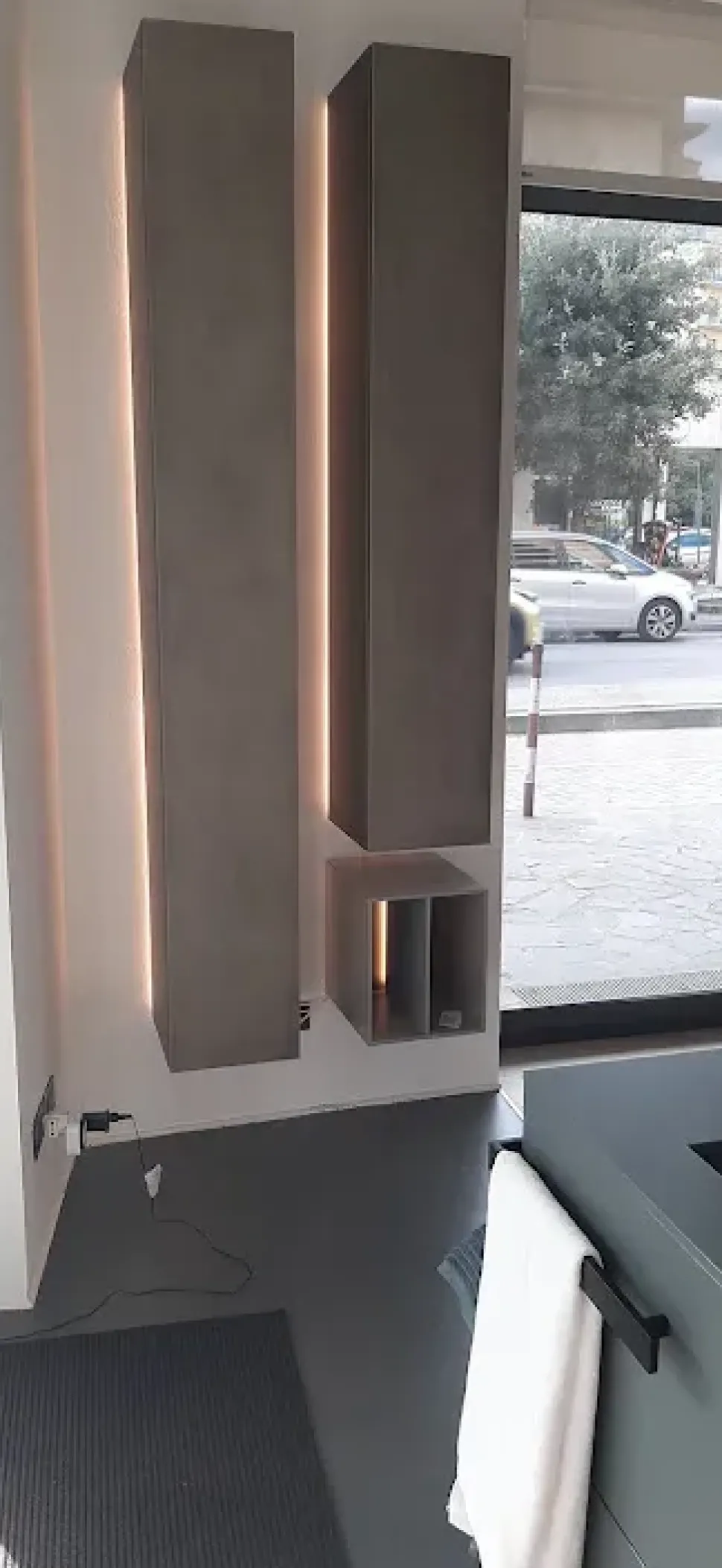 La nostra proposta è composta da 2 colonne sospese retroilluminate con led dimmerabili e un piccolo vano a giorno portalibri