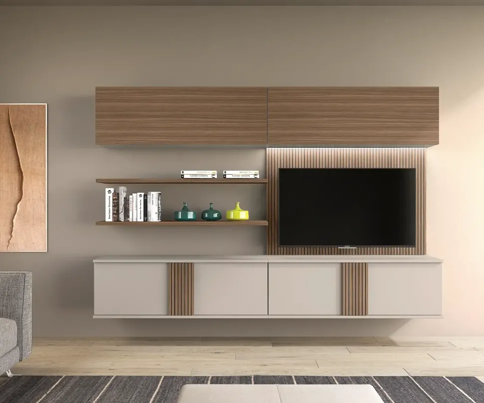 Linee essenziali, finiture moderne e una raffinata combinazione tra tortora e legno: la serie Riga è pensata per chi cerca un living personalizzabile e di carattere. Moduli sospesi, vani chiusi o a vetro, pensili e mensole si combinano liberamente per creare pareti attrezzate su misura, funzionali e dal gusto contemporaneo.