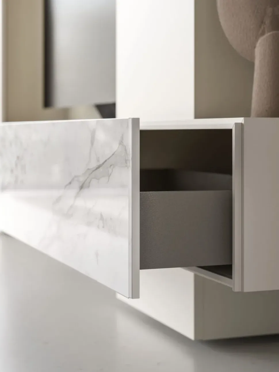 Cassetto Compongo con frontale in vetro serigrafato Calacatta Gold.