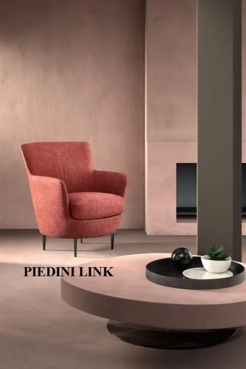 Poltroncina mod. Moon High di Samoa con piedini Link di serie , a richiesta con basamento star girevole in metallo finitura Manganese.