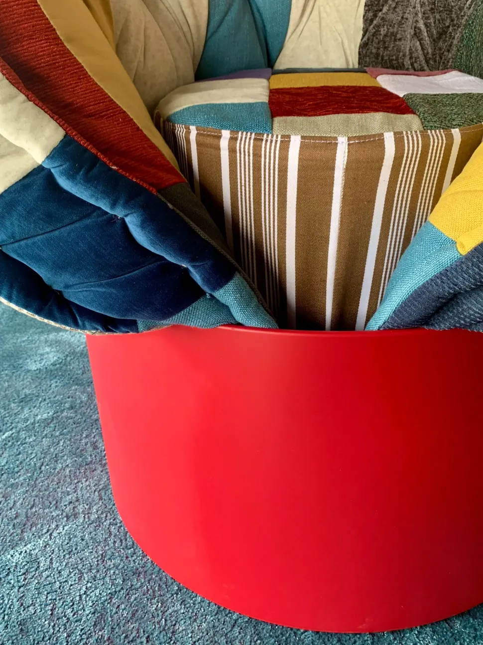 FINITURA: Tessuto Patchwork, base laccata colore rosso. Poltrona letto con materasso avvolto a cono e infilato dentro a una piccola base cilindrica. Sfilando la base, il materasso si srotola automaticamente e diventa un comodo letto d’emergenza. Si può inoltre capovolgere la base e trasformarla in un pratico comodino.