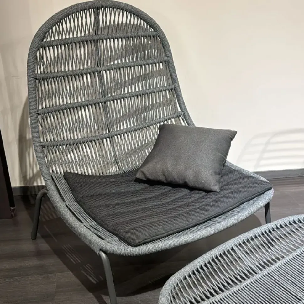 La struttura è in alluminio ricoperta da un intreccio di corde nautiche sintetiche che rendono il prodotto estremamente resistente agli agenti atmosferici. Il cuscino 80×60 cm, compreso nel prezzo, è realizzato in tessuto.