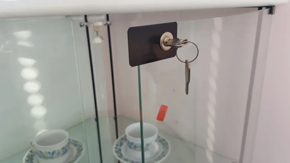 Le ante chiudono a filo dei ripiani stondati , vi è a possibilità di chiudere il mobile a chiave. All’interno nel ripiano superiore è alloggiato un faretto che permette di illuminare l’interni della vetrina.