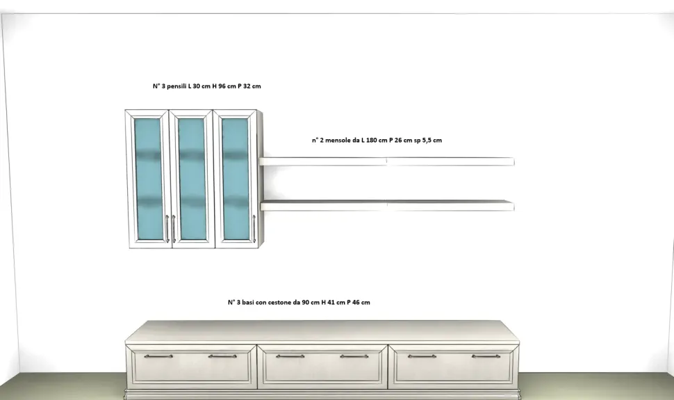 Il mobile TV da L 270 CM H 195 CM P 46 CM (altezza variabile in base al montaggio) si compone di tre basi con cestone da 90 cm H 41 cm P 46 cm e da tre pensili da L 30 cm H 96 cm P 32 cm, oltre due mensole da l 180 cm P 26 cm SP 5,5 cm.