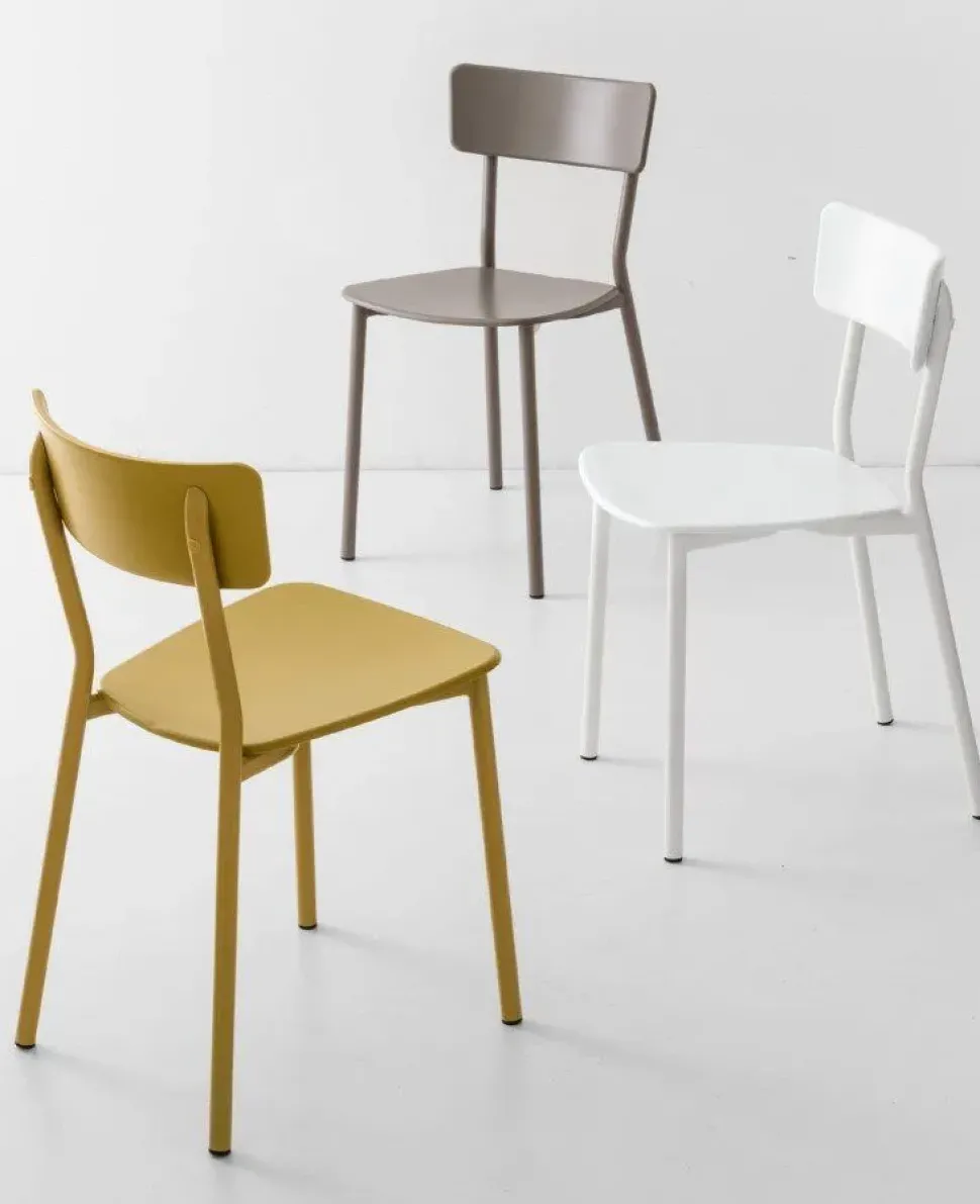 Una struttura lineare che si differenzia dalle altre sedie per i materiali di alta qualità e per gli standard di realizzazione tutti made in Italy. La struttura è in metallo e la seduta in polipropilene. I colori sono classici e particolari nello stesso tempo: si può infatti scegliere fra il bianco, il grigio oppure propendere per un tortora o anche il senape opaco.