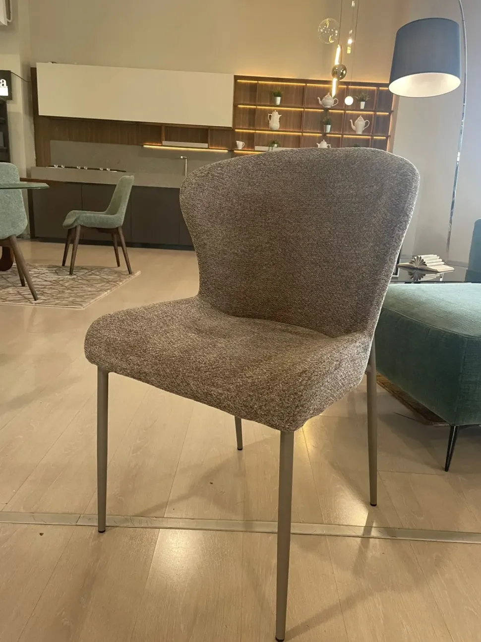 Sedia imbottita in tessuto effetto bouclè con base metallica laccata grigio chiaro