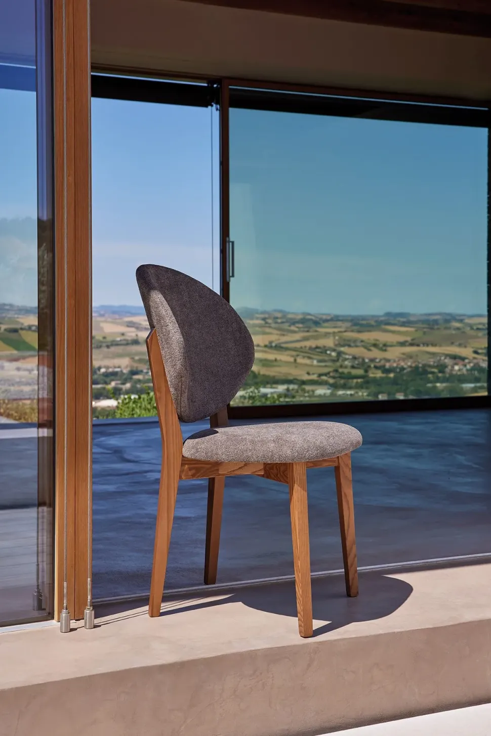 Lo schienale generoso di questa sedia fa trapelare il richiamo agli arredamenti vintage, quelli dei film anni ’50, quando il design è in fermento ed entra anche negli ambienti più tradizionali. E qui si apre ulteriormente al contemporaneo. Sedia Sveva S166 con gambe in frassino, seduta e spalliera in tessuto, ecopelle o lana in diverse varianti colore.