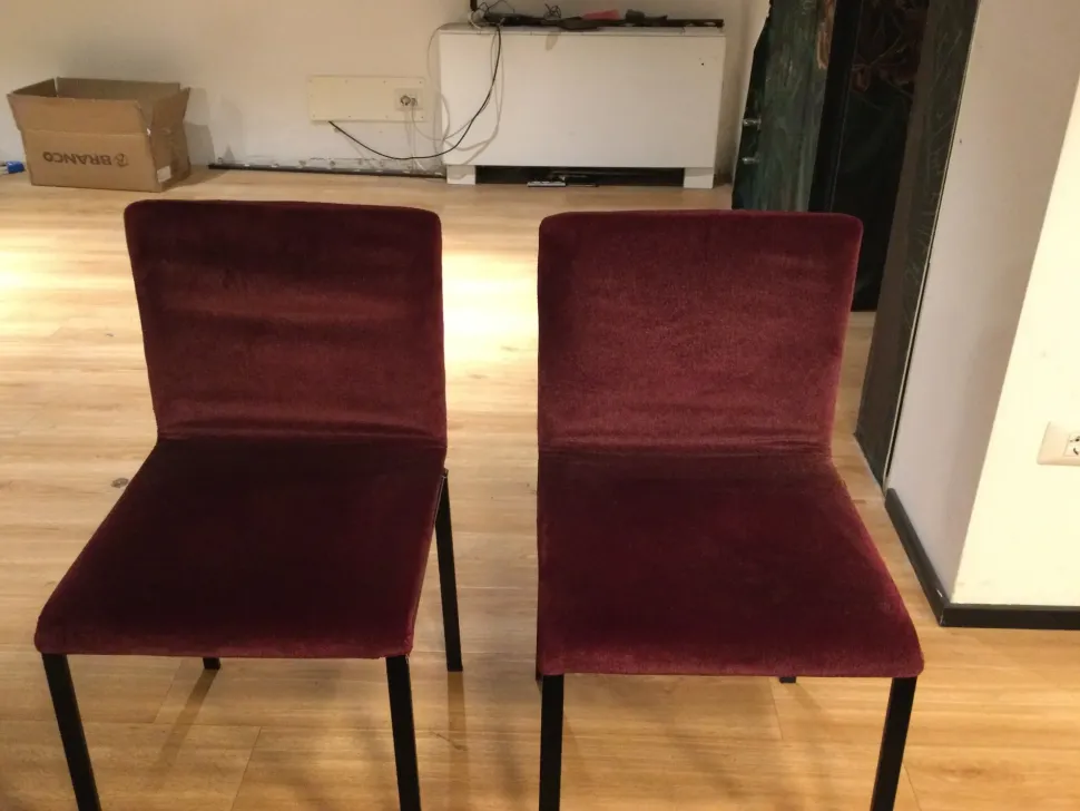 Sedie Dangla di Lago con gambe nere e rivestimenti in tessuto bordeaux. Disponibili solo in versione liscia. Disponibilità 2 pezzi vendibili anche separatamente.
