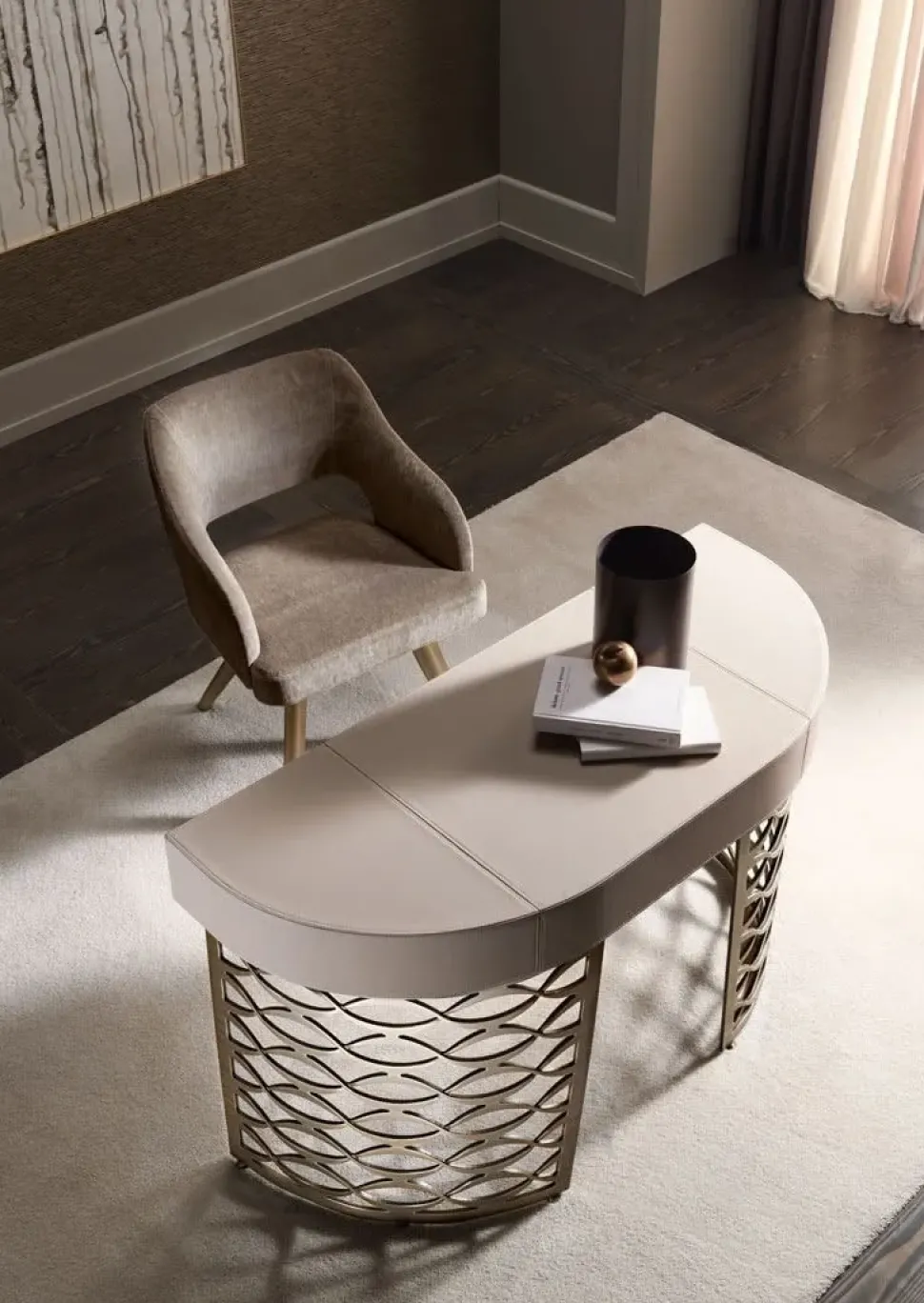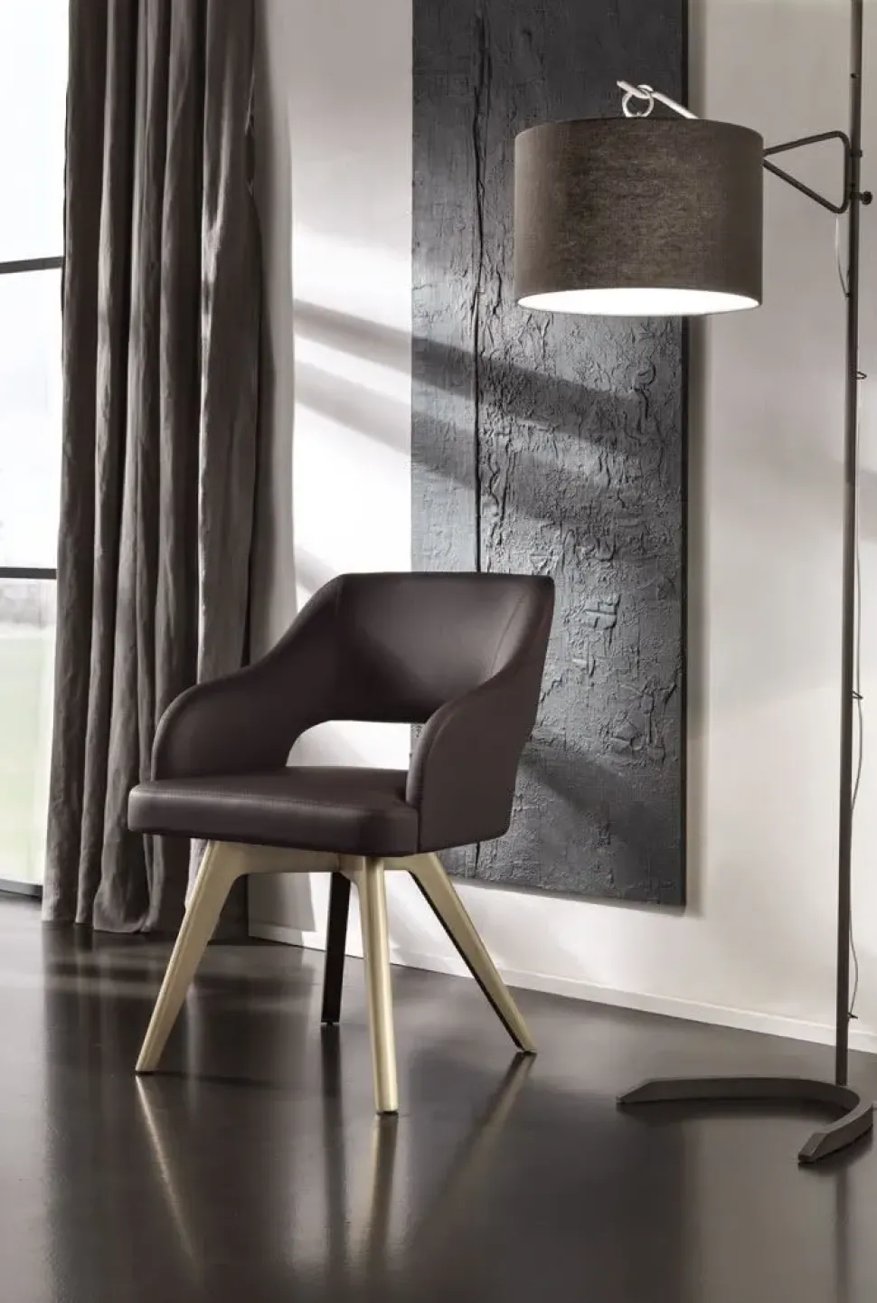 E può essere usata come poltroncina. I gambi sono in metallo tagliati a laser e curvati. La seduta e lo schienale dalla linea sagomata sono rivestiti in modo sartoriale in tessuto, velluto, pelle o con un rivestimento personalizzato.