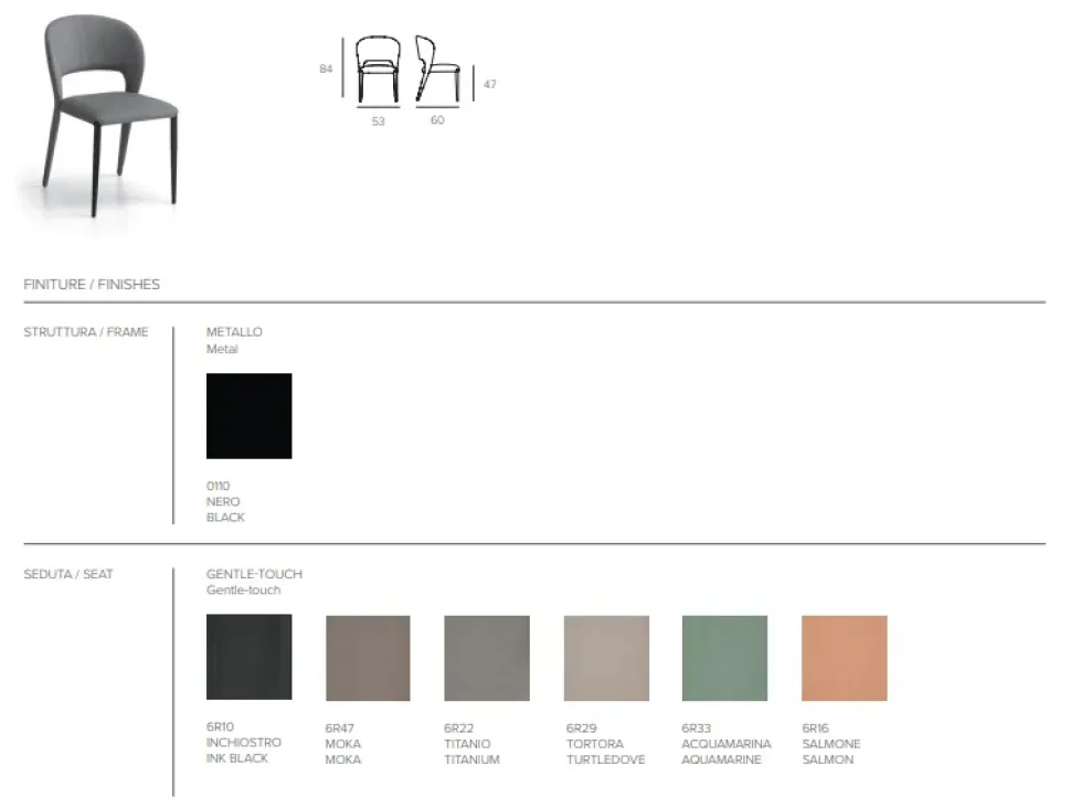 Sedia con struttura in metallo, seduta e gambe posteriori rivestiti in morbido Gentle-Touch.