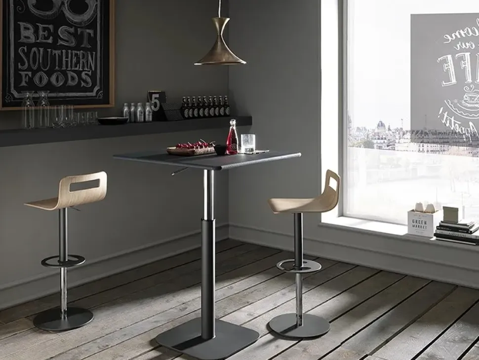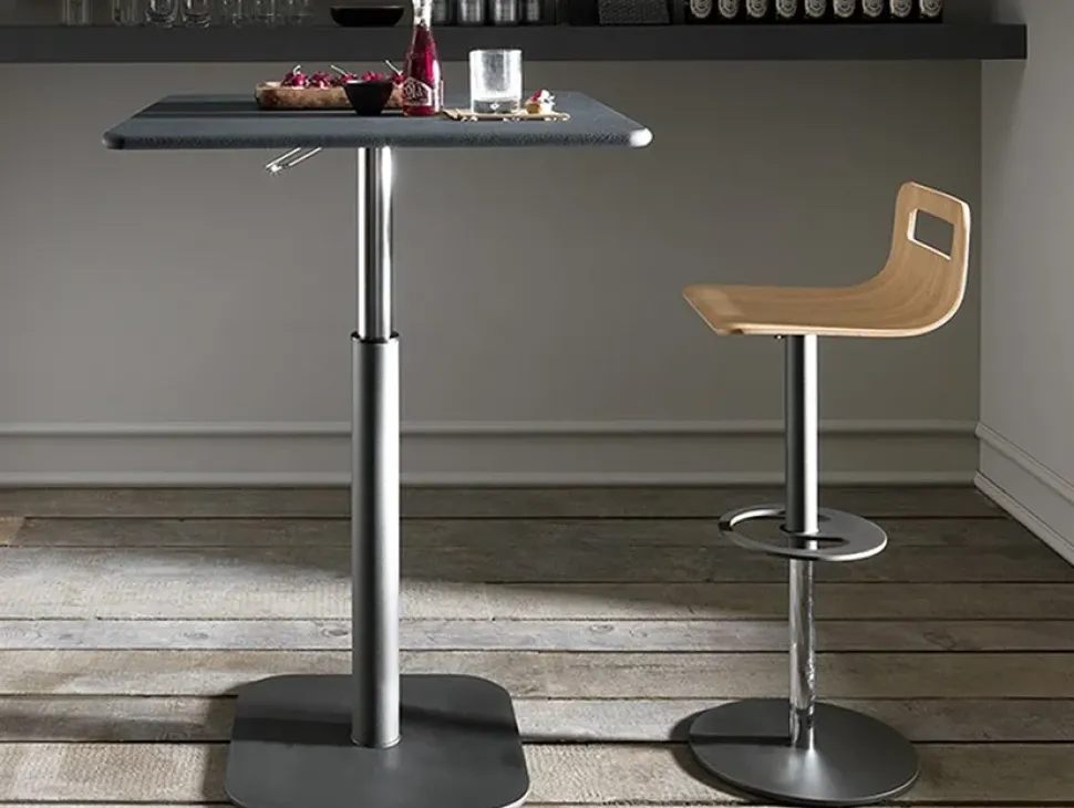 LO SGABELLO DROP ANCH’ESSO REGOLABILE IN ALTEZZA INDUCE AD ACCOMODARSI PIACEVOLMENTE NELLA SEDUTA “MONOSCOCCA” PER GODERSI UNO SNACK O SORSEGGIARE UN DRINK IN PIACEVOLE COMPAGNIA.