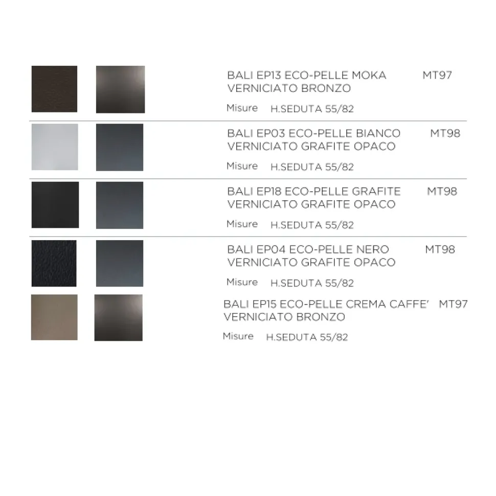 Seduta in eco pelle. Struttura e poggiapiedi in metallo verniciato grafite o bronzo.
