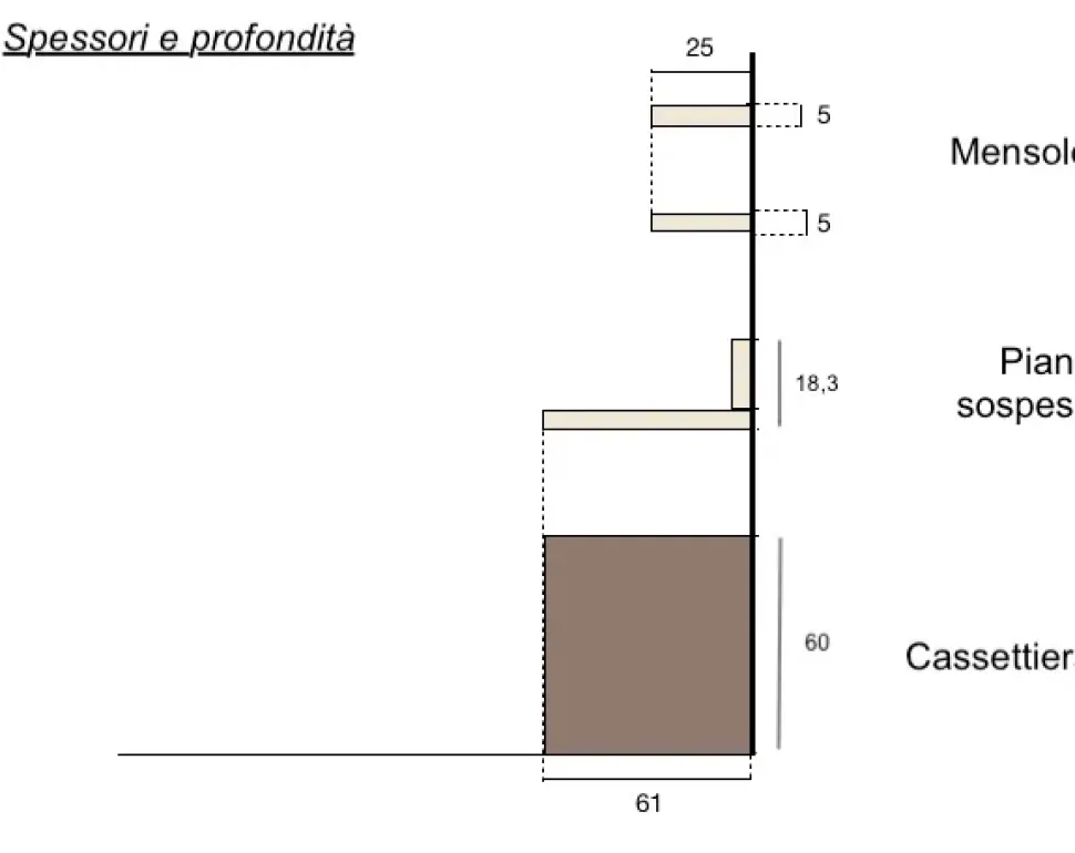 – Un piano scrittoio sospeso con alzata ( larghezza 140 cm, spessore 5 cm, profondità 61 cm) e due mensole (spessore 5 cm, larghezza 120, profondità 24 cm) in nobilitato finitura canapa.