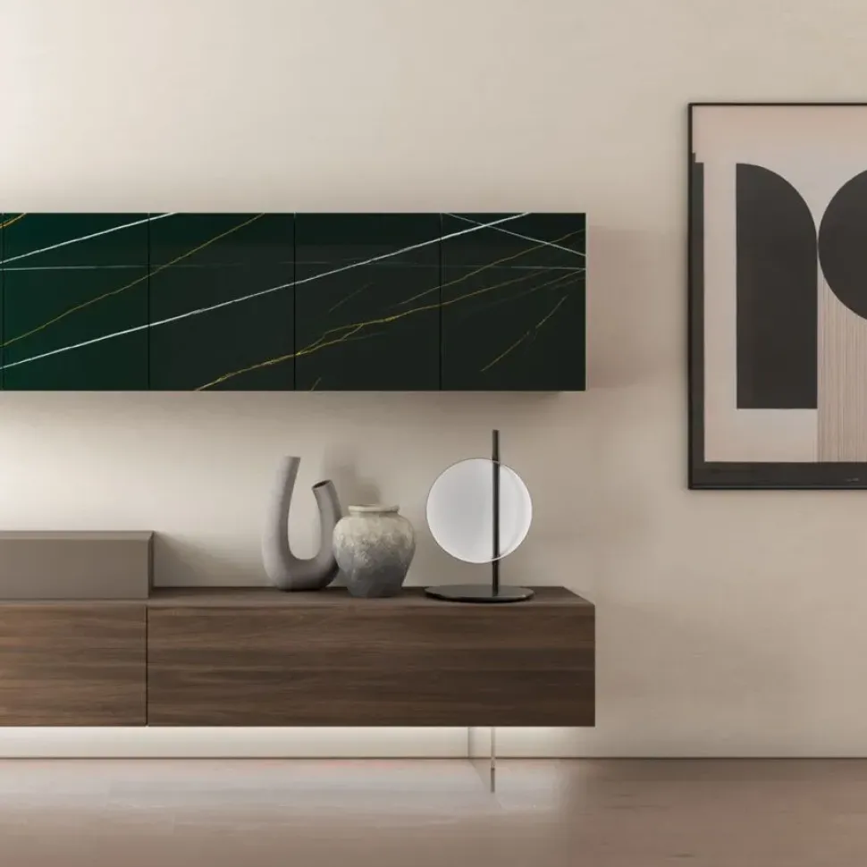 Questa soluzione appartiene alla nostra serie di soggiorni completi con mobili senza maniglia del marchio Orme, ideali per spazi di ogni tipo.