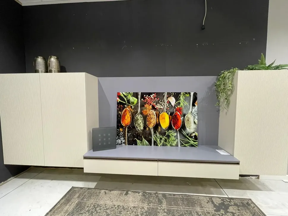 Parete sospesa composta da moduli con anta grecato laccato opaco avorio, e cassetti sospesi con piano e pannello retro tv laccato opaco nevada.