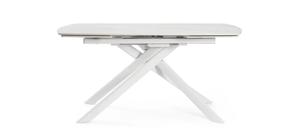 Tavolo allungabile girevole con BASE IN ACCIAIO VERNICIATO A POLVERE EPOSSIDICA. PIANO IN GRES PORCELLANATO CON EFFETTO MARMO BIANCO OPACO. DA ASSEMBLARE.