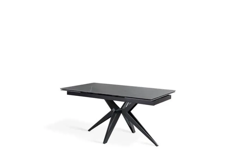 Tavolo allungabile con Top in ceramica marmo grigio, quattro gambe a stella in metallo nero opaco e allunghe a scomparsa in ceramica marmo grigio.