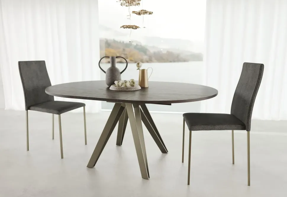 Tavolo fisso o allungabile con basamento in metallo verniciato e piano disponibile in finiture e dimensioni differenti, sia nella versione allungabile che nella versione fissa. Finiture disponibili per il piano: Rovere impiallaciato, melaminico, vetro lucido, vetro ceramica opaco e lucido