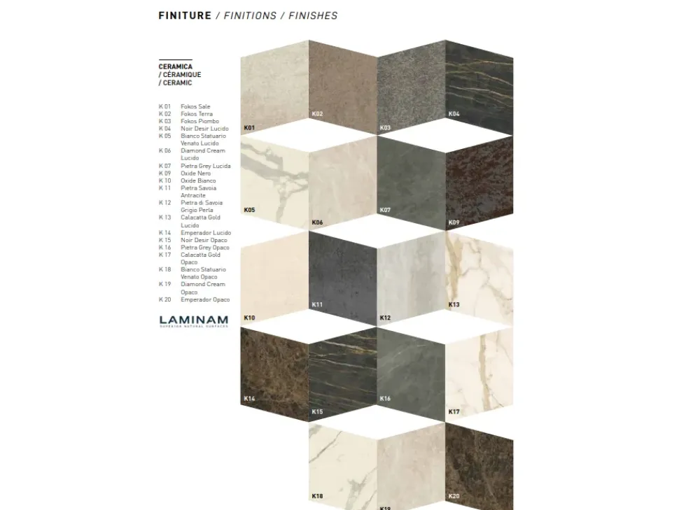 Piano in nobilitato, vetro, legno, effetto malta o ceramica e prolunga interna a libro.