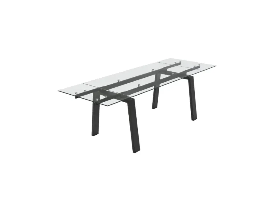 Zeffiro è il tavolo allungabile con piano in vetro o ceramica. Disponibile con struttura in metallo, il tavolo è allungabile grazie a due allunghe laterali indipendenti, che agiscono su guide in alluminio, in tinta con le gambe.