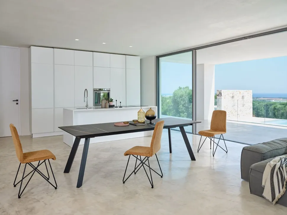 Tavolo Denver T52 con gambe in metallo di cui due dotate di ruote, allungabile telescopico con maxi allunga, disponibile con piano in vetro o vetroceramica keramic; superallungabile con telaio multiprolunghe in alluminio ad apertura telescopica disponibile con piano impiallacciato oppure melaminico.