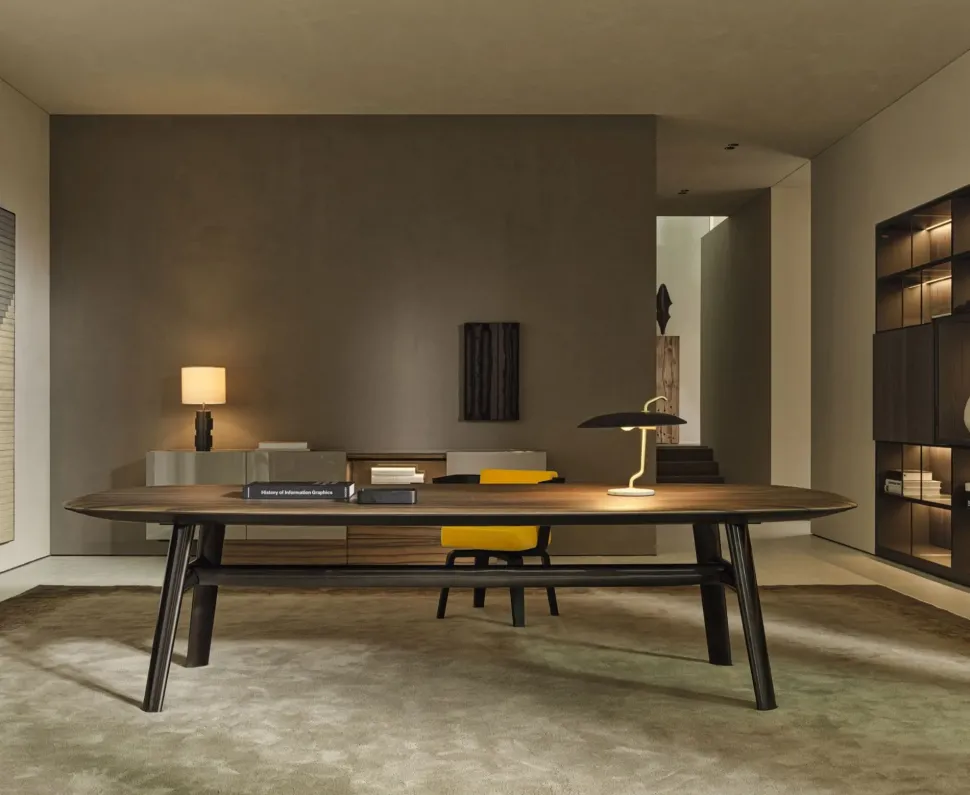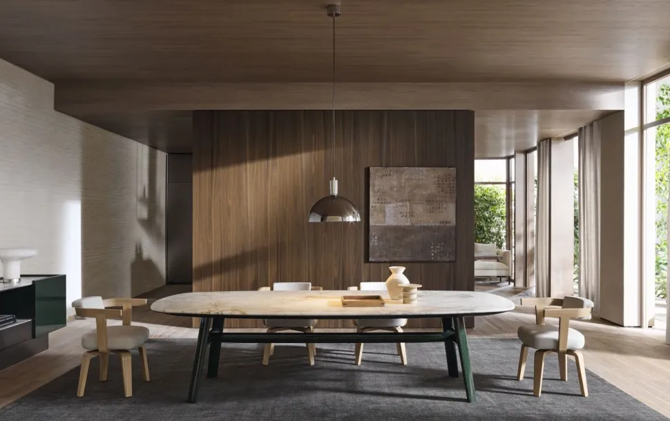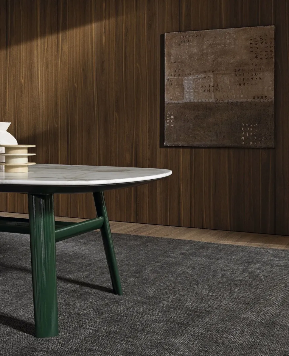 Il tavolo è composto da un piano dai bordi arrotondati che si incurvano dolcemente verso il basso per incontrare quattro gambe laccate lucide, collegate da una struttura a forma di H. Il top ricercato è disponibile in legno di limba o rovere color caffè e in marmo Emperador, Calacatta o Sahara Noir con finitura in poliestere opaco o lucido. Simile a un guscio, la base del piano è contraddistinta da morbide linee color antracite che evocano uno stile elegante e moderno. Le gambe, invece, sono proposte in tre diverse finiture laccate lucide: rosso borgogna, verde pino o nichel nero.