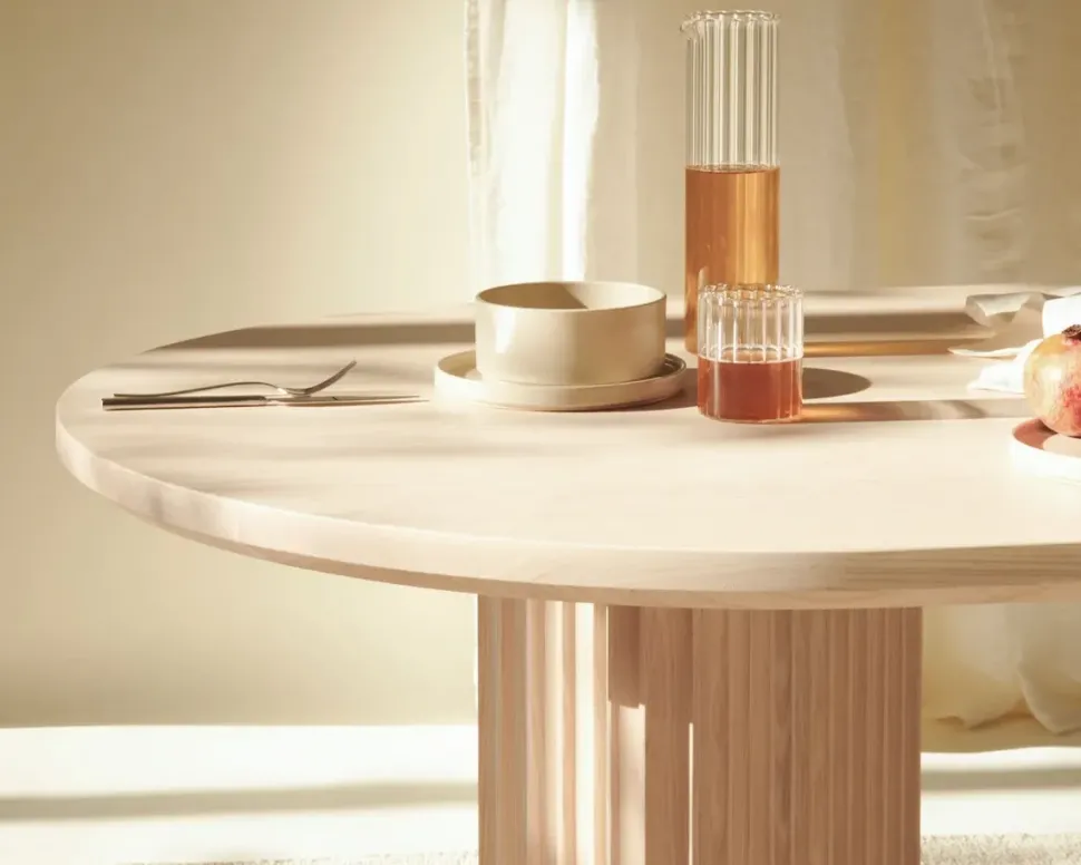 Basalto minimizza i propri elementi architettonici per enfatizzarne il valore visivo. L essenzialità del piano e il pattern delle gambe produrre un contrasto di spessori e ritmi. La struttura è interamente in massello di Frassino Bianco.