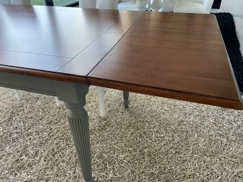 Tavolo a pianoforte allungabile bicolore con piano in noce , si tratta di un tavolo rettangolare misure 180x90x78h allungabile con 2 allunghe da 40 cm cad. , dalla particolare apertura a pianoforte che da accesso al vano sotto piano dove si possono riporre le allunghe e altri oggetti.