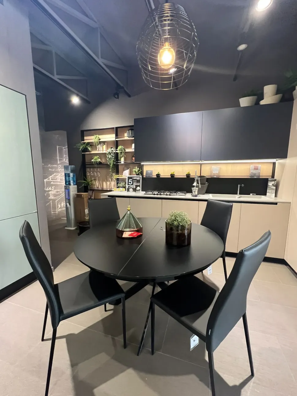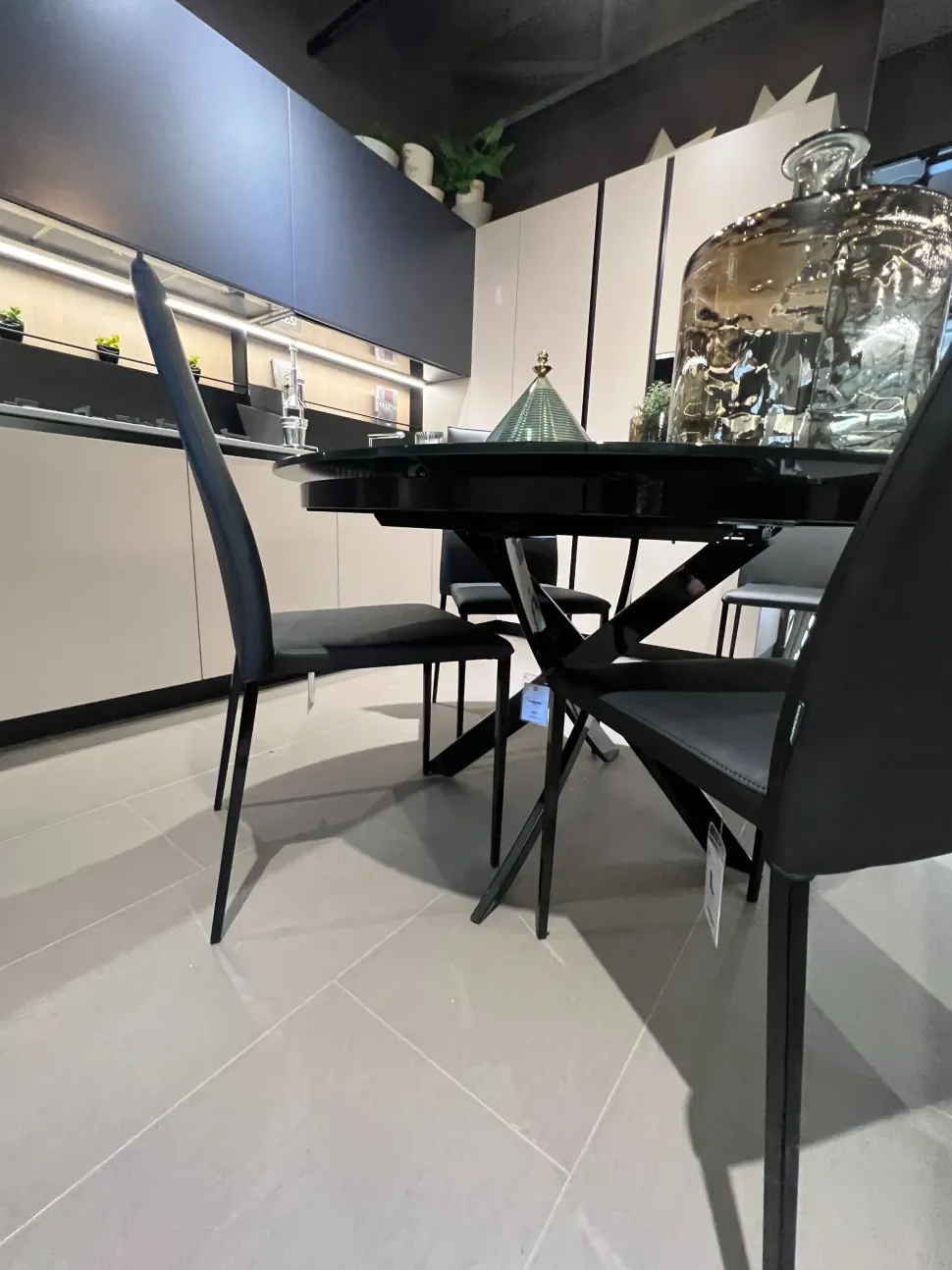 TAVOLO ROTONDO ALLUNGABILE CON VETRO VELVET ANTIGRAFFIO NERO OPACO E STRUTTURA IN NERO PROFONDO LUCIDO.