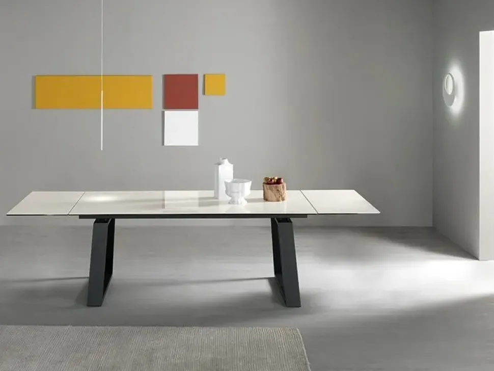 Tavolo allungabile con gambe trapezoidali in metallo verniciato a polvere. Telaio allungabile in alluminio con 2 allunghe. Piano in ceramica.