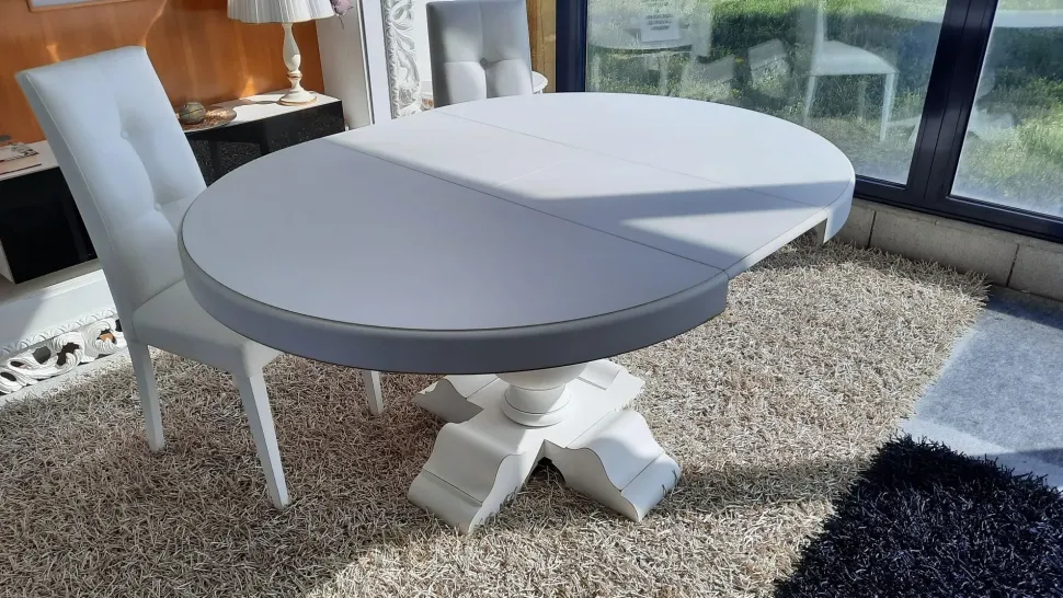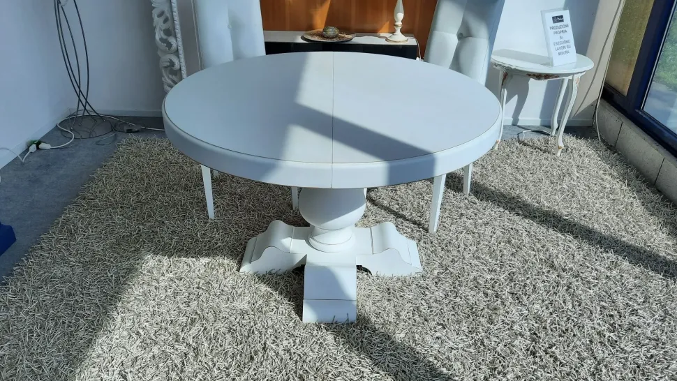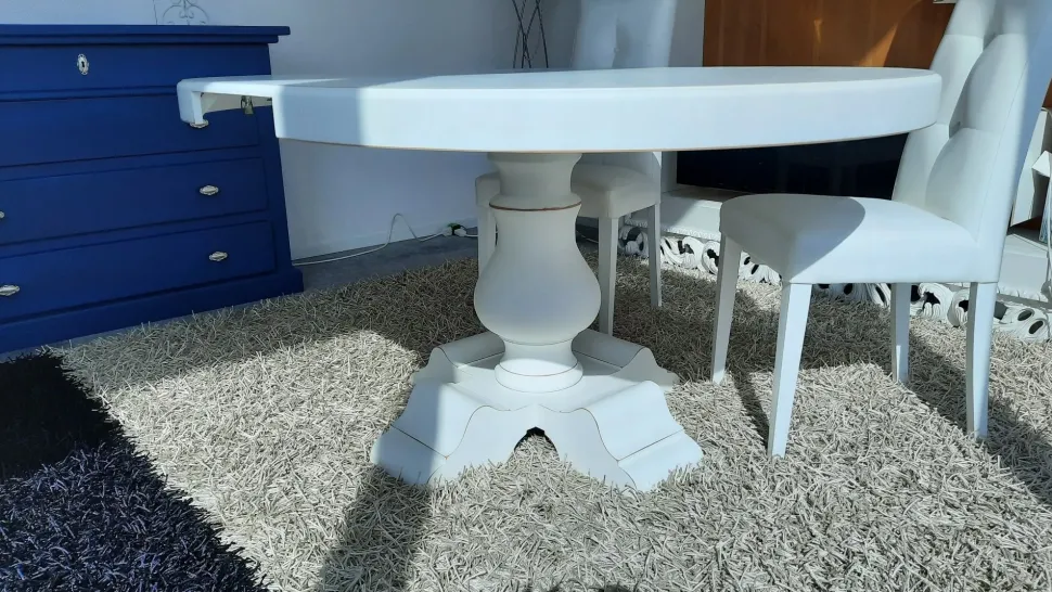 Tavolo Artigianale Allungabile modello Amalfi in legno massiccio con gambone centrale, lavorato interamente a mano , colore bianco opaco con bordi leggermente consumati , disponibile anche in colore personalizzato , adatto per qualsiasi ambiente , misure diametro 120(+1 allunga da 40 cm) x78H