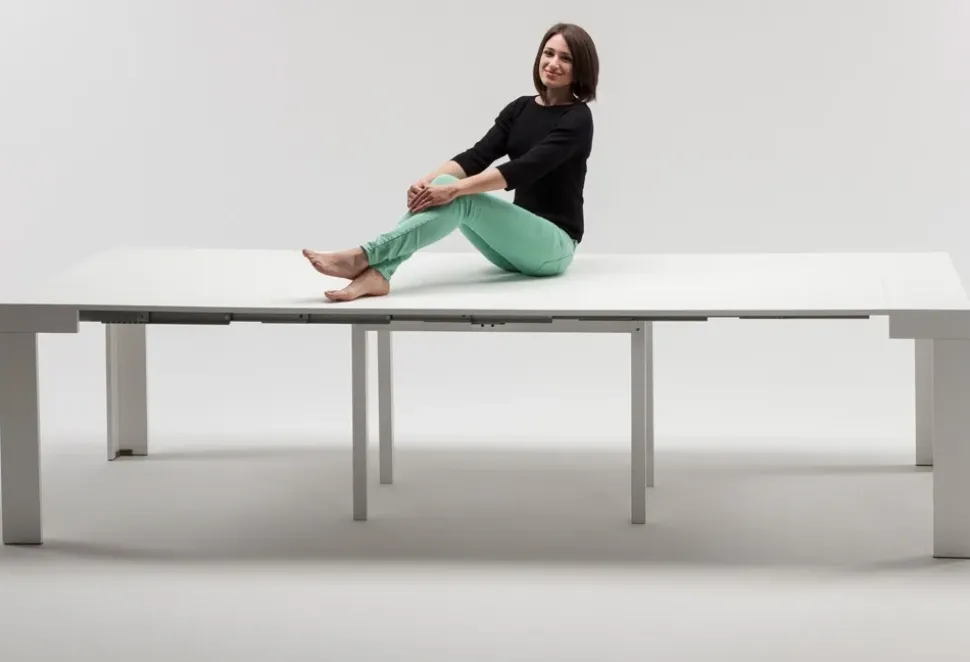 Questo è un tavolo molto pratico perchè ,da misure piccole ,si estende moltissimo senza il disturbo delle gambe quando è aperto;
