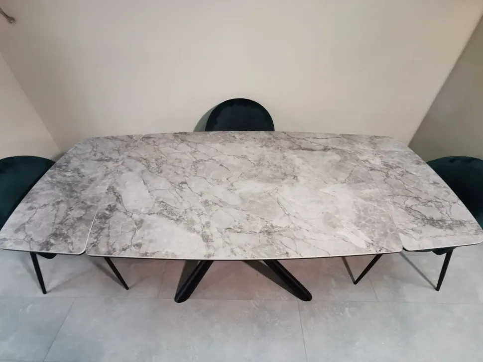 OFFERTA COMBINATA PER TAVOLO ALLUNGABILE + N?4 SEDIE IMBOTTITE. TAVOLO MOD. NEWPORT CON BASAMENTO CENTRALE IN METALLO VERNICIATO”NERO” CON PIANO E ALLUNGHE IN VETRO CERAMICA “MARMO GRIGIO LUCIDO” (ALLUNGHE LATERALE SX E DX). DIMENSIONI 130 x 88 CM ALLUNGABILE FINO A 200 CM.