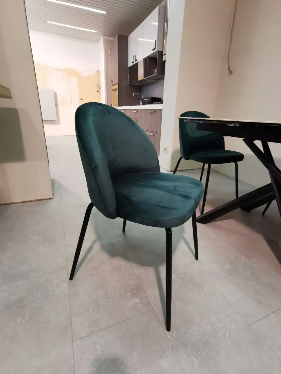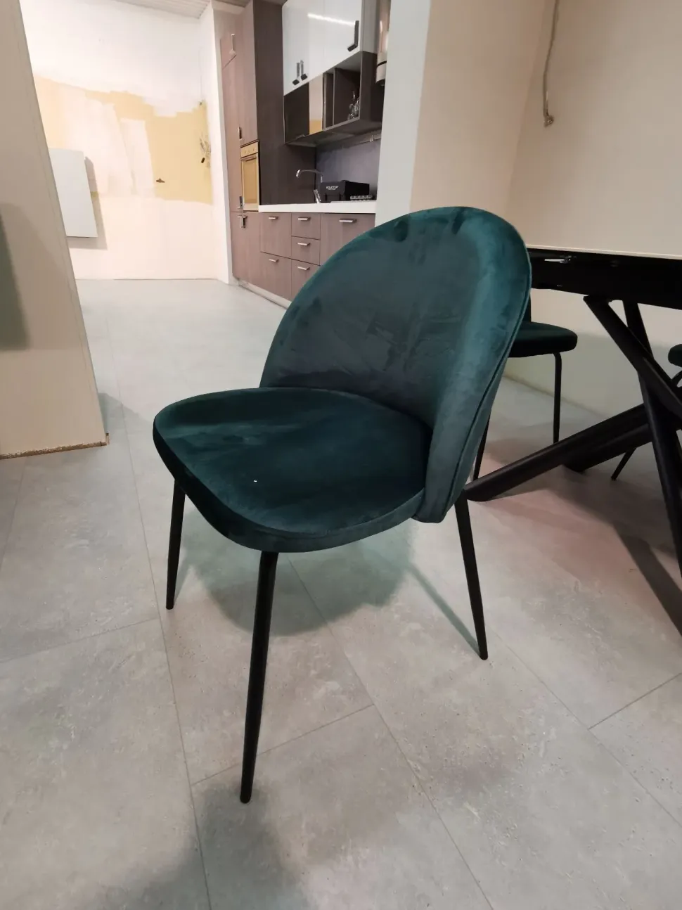 N?4 SEDIE IMBOTTITE CON RIVESTIMENTO IN TESSUTO VELLUTO “VERDE BOSCO” CON GAMBE IN METALLO VERNICIATO NERO.