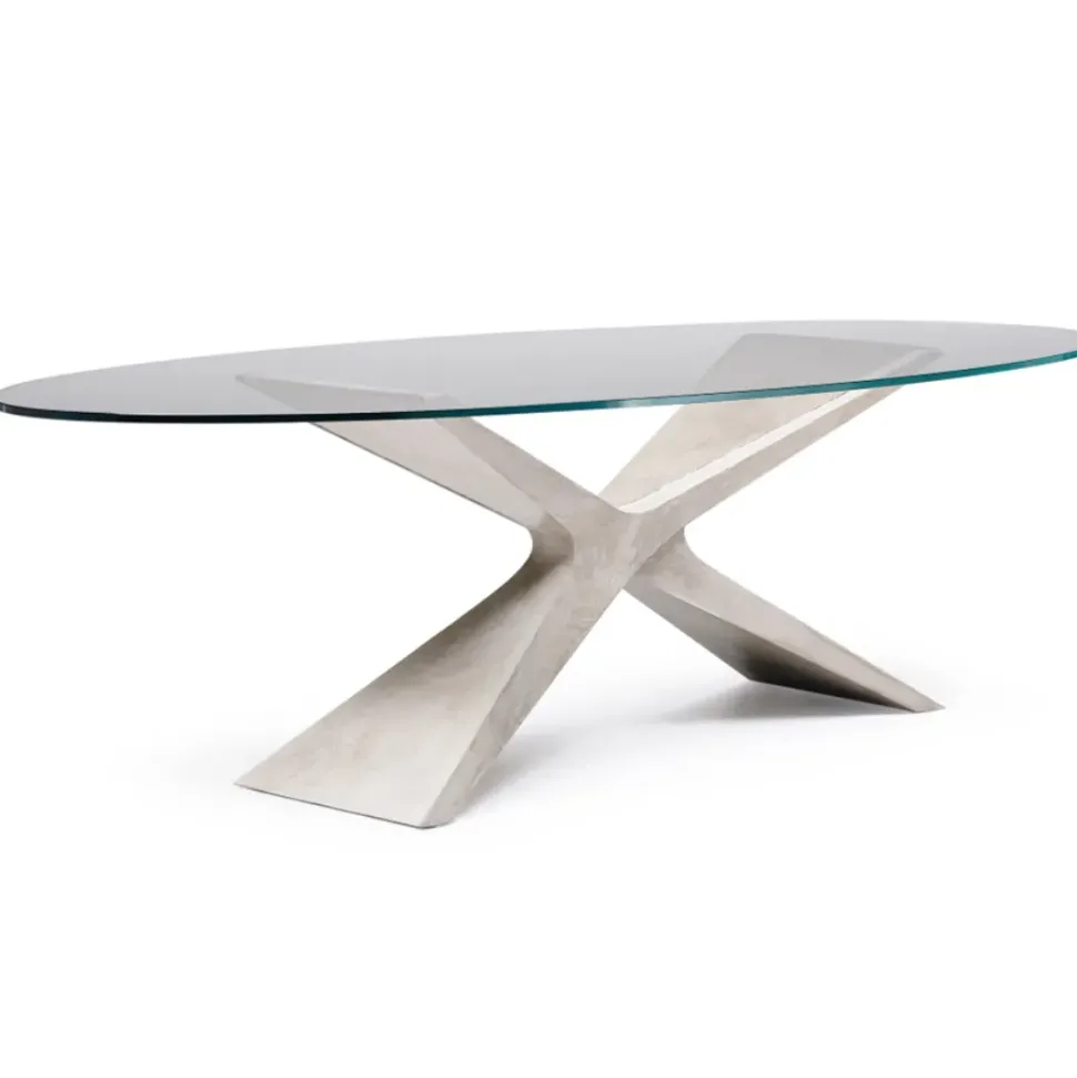 Tavolo Ratatani è un elemento di design realizzato artigianalmente con grande attenzione per finiture e materiali. Presenta un piano ovale in vetro trasparente extrachiaro ed una struttura a basamento centrale incrociato realizzato in baydur, materiale innovativo ad alto contenuto tecnico ed estetico . E’ possibile scegliere il colore del basamento fra: bianco (in foto), grigio cenere e grigio scuro (in foto sotto). Il tavolo misura 280 x 120 cm con un’altezza di 76 cm.
