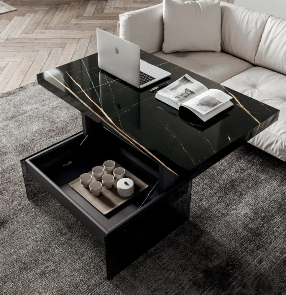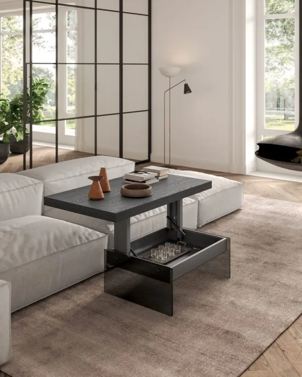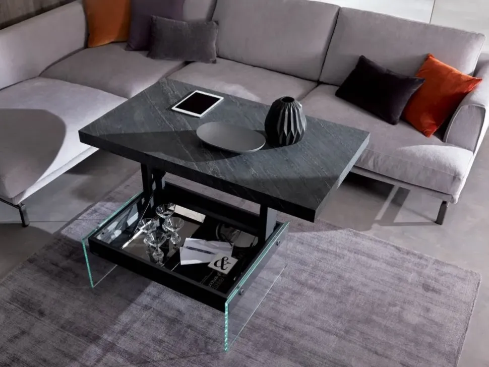 Tavolino trasformabile 68/9797×117 a 2 altezze (cm 32 o cm 65), struttura in metallo, piano disponibile in rovere wild, noce canaletto, rovere vecchio, marble glass opaco o lucido, gambe in cristallo e meccanismo di sollevamento a gas auto-frenante.