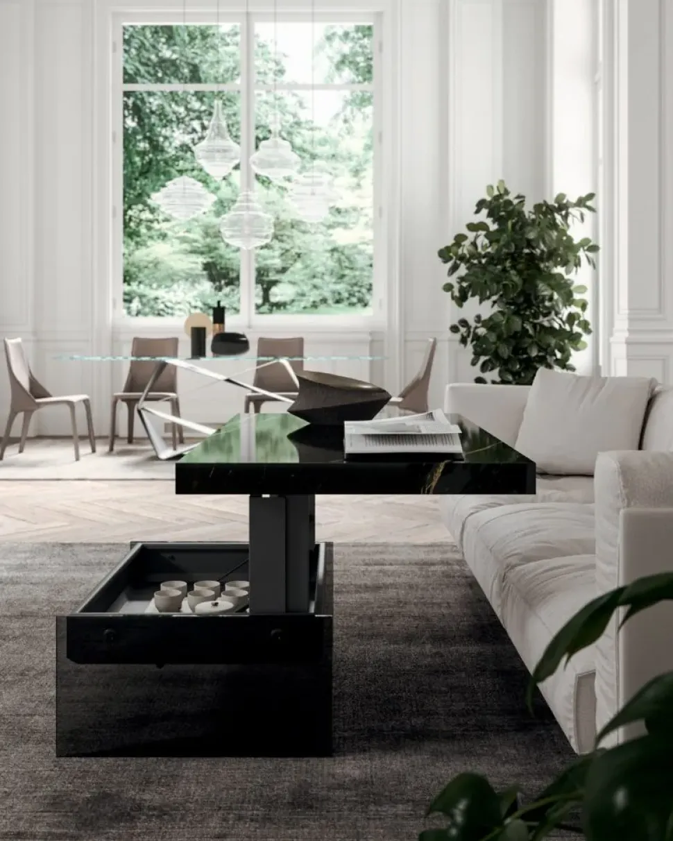 Nel dining o nel living, la scelta dei tavoli è vincolata allo spazio a disposizione: la norma generale dice che ci sia lo spazio utile per muoversi con libertà nell’area fra il tavolo e l’eventuale parete dietro; l’acquisto dei tavoli, perciò anche questo modello Bellagio scontato, dipende dal mood dell’ambiente e dell’arredo già presente.
