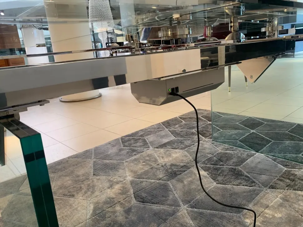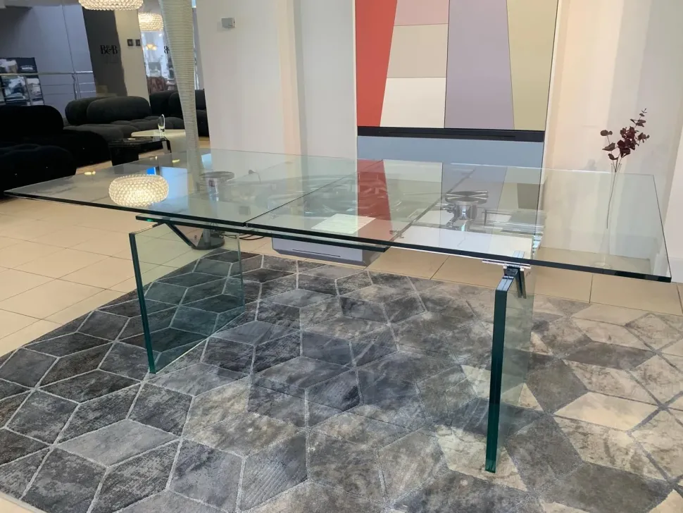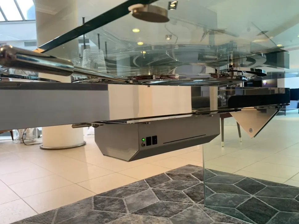 Top in cristallo naturale, gambe in cristallo stratificato, meccanismo cromo (con motore)