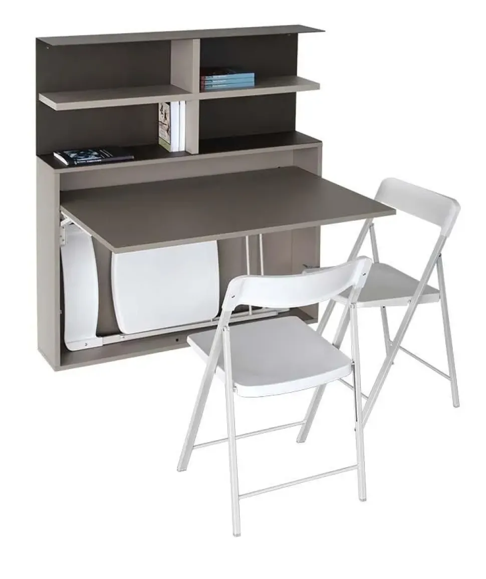 Bureau è composta da un tavolo/scrivania a scomparsa a parete, al cui interno possono essere riposte fino a 3 sedie chiudibili modello Zeta, e da un’ampia libreria da parete con struttura in acciaio verniciato. Bureau è l’elemento perfetto per arredare la propria casa in modo professionale ed elegante, e nel rispetto dell’ambiente: infatti il piano di questa scrivania è in laminato ecologico, che garantisce comunque grande stabilità ed efficienza.Il suo design, dalle linee semplici ma estremamente raffinate, lo rende un prodotto ricco di personalità che darà un tocco di modernità alla tua casa.