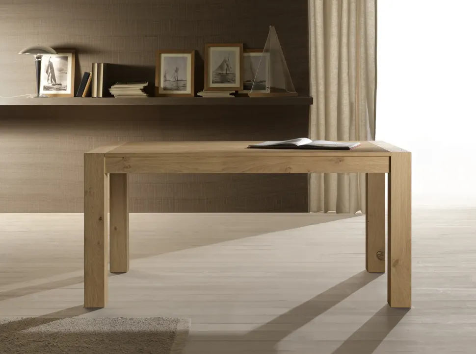 Tavolo impiallacciato allungabile in quercia nodata con sistema telescopico con 2 allunghe da 50 cm. Gambe di dimensioni 10×10, H: 77 cm. Disponibile in diverse finiture, diverse dimensioni ed anche quadrato.