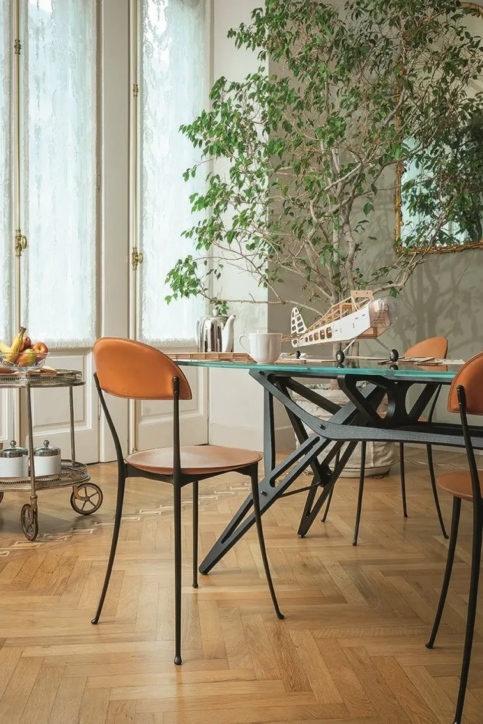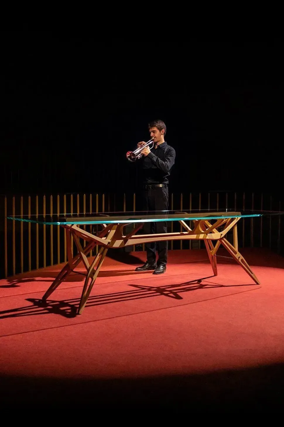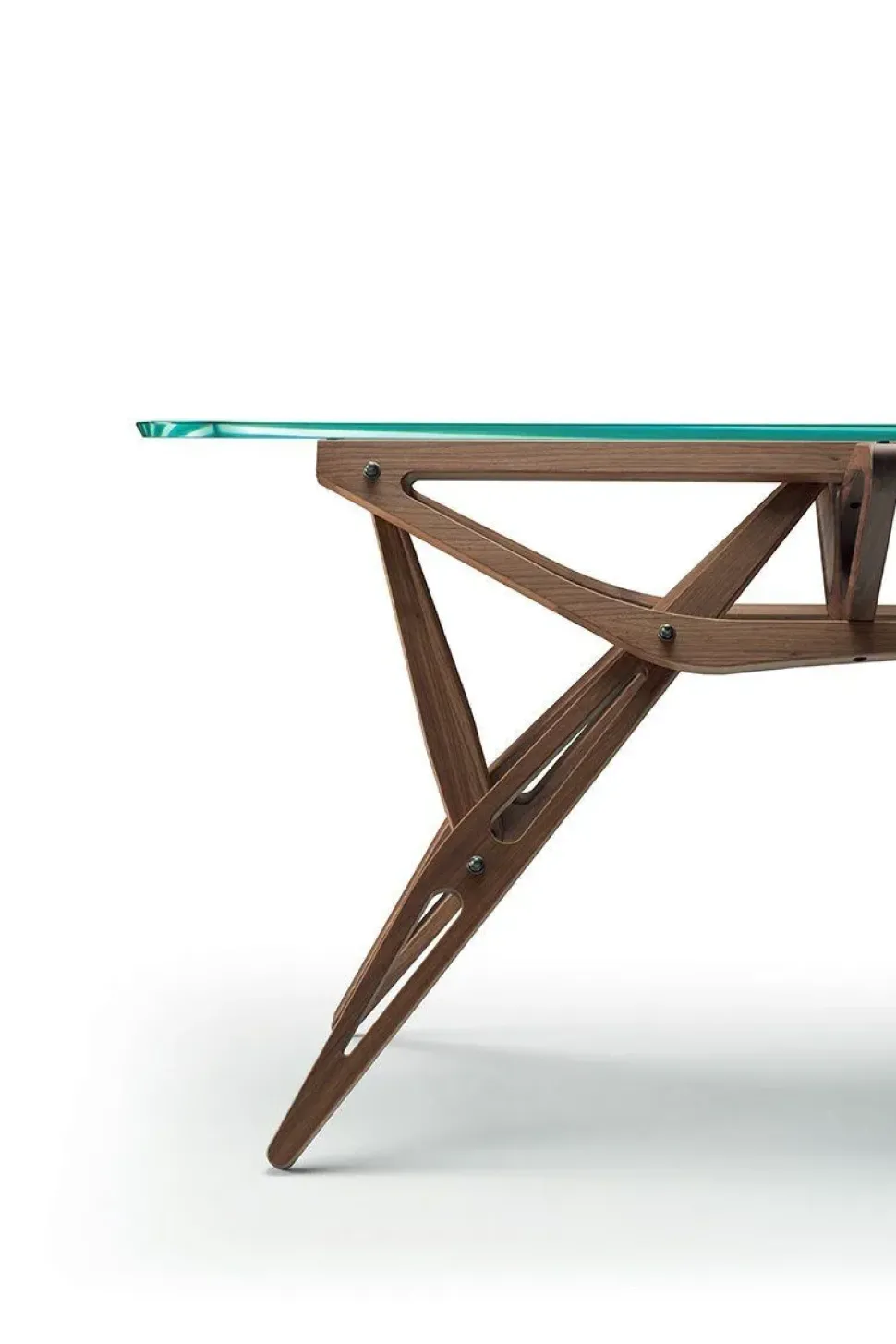 Un tavolo dalla struttura in legno massello organica, solida e leggera, come fosse il dettaglio di un’ala di un aeromobile.