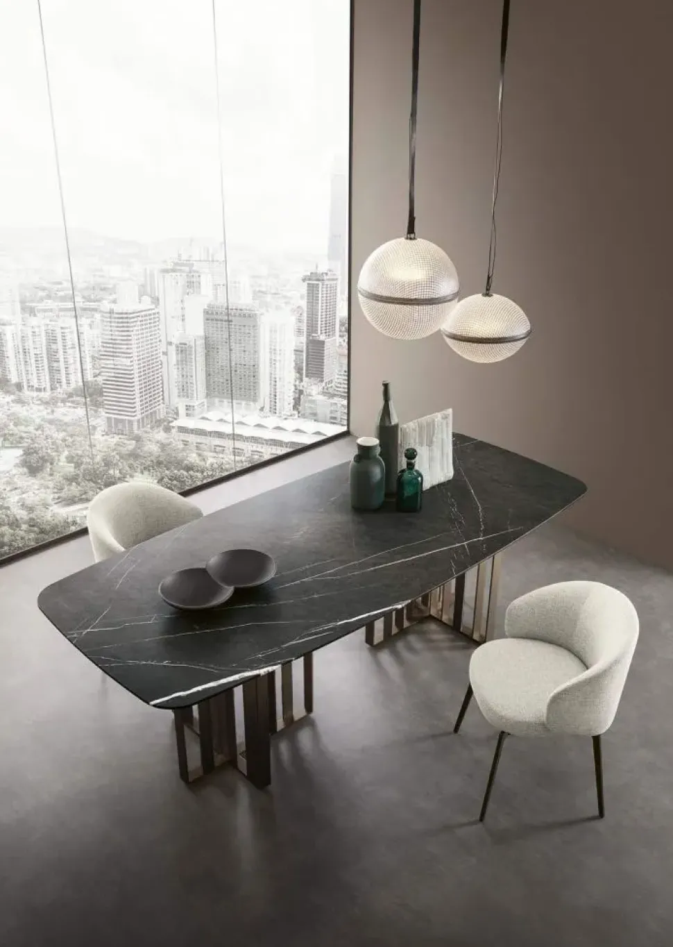 Dall’appeal scultoreo, il tavolo da pranzo Shade è caratterizzato da un armonico abbinamento tra il metallo bronzato della base e il sottile piano a contrasto. Il piedistallo scultoreo è formato da delicate lastre in metallo con finitura bronzo trattato disposte a croce asimmetrica. Il piano, disponibile in diversi materiali e finiture, ne completa l’estetica. Le misure generose lo rendono un perfetto centro stanza, sia esso un tavolo da pranzo o tavolo riunione.