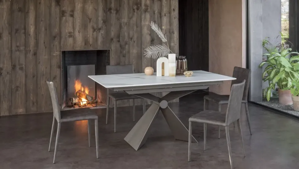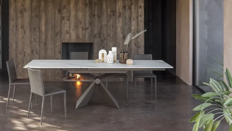 - Design elegante e moderno: il tavolo Sintesi presenta una forma rettangolare allungabile e un basamento centrale che conferiscono un aspetto contemporaneo e raffinato all’ambiente in cui viene collocato.