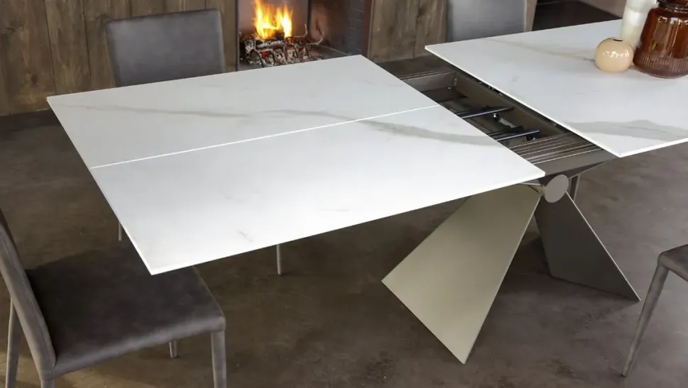 Il sostegno centrale in metallo caratterizza il tavolo, garantendone la stabilità durante il movimento di apertura sincronizzata della prolunga a libro.