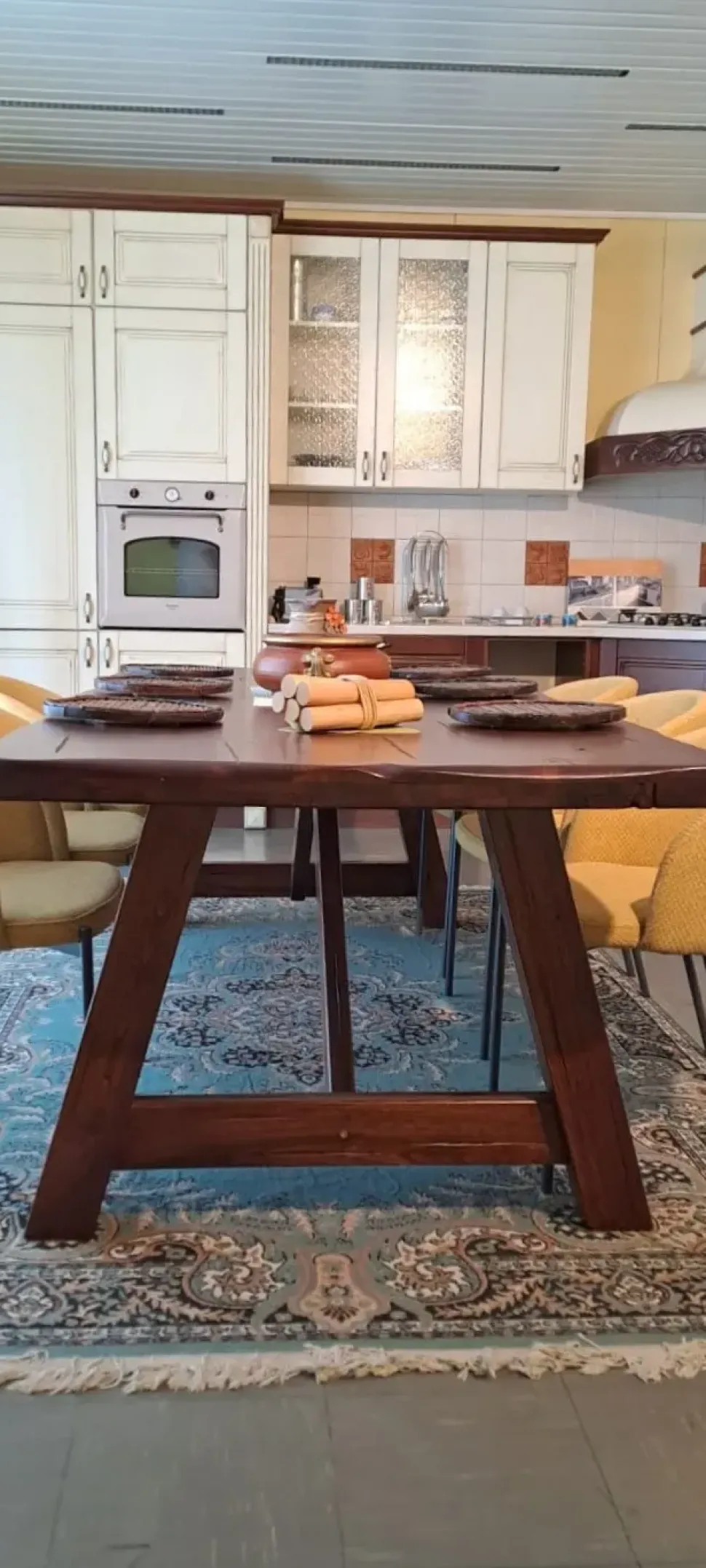 Tavolo Artigianale in massello di Castagno Dell’Etna con piano fortemente spessorato da 6 centimetri. Essenza castagno tinteggiato noce scuro con possibilità di cambiare tinte e finiture. Dimensioni: Lunghezza da 250 cm. – Altezza 77 cm. – Larghezza 104 cm. Basamento a cavalletto auto portante per un piano di peso. Manufatto con vecchi metodi artigianali dal design abbinabile ad ambienti dai più variati stili di arredo.