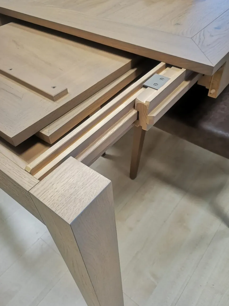 Il tavolo è di dimensioni 140×90 cm. con la possibilità di aggiungere una o due allunghe a scelta.
