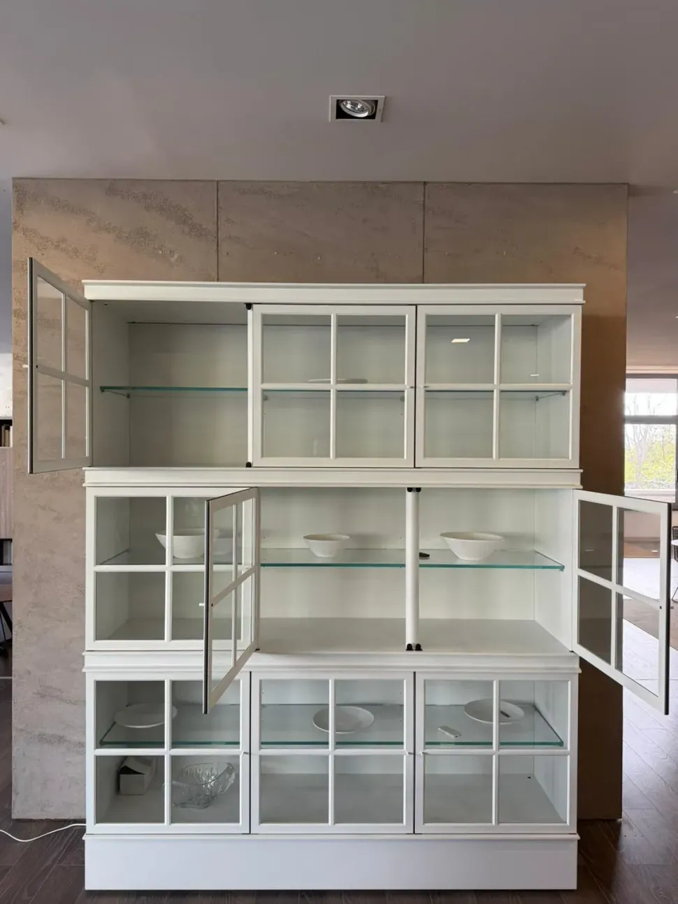 La versione in offerta è realizzata in laccato opaco bianco, con frontali raffinati e ripiani in vetro che permettono di esporre oggetti con leggerezza visiva. È prevista l’illuminazione interna a LED, per valorizzare i contenuti esposti.