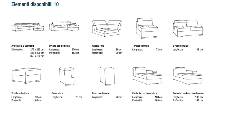 - Il divano è disponibile in 5 posti con una lunghezza compresa tra 326 e 350 cm.