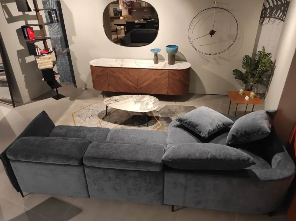 Composizione divano dal design contemporaneo con forme morbide a seduta fissa con tessuto imbottito in memory foam .