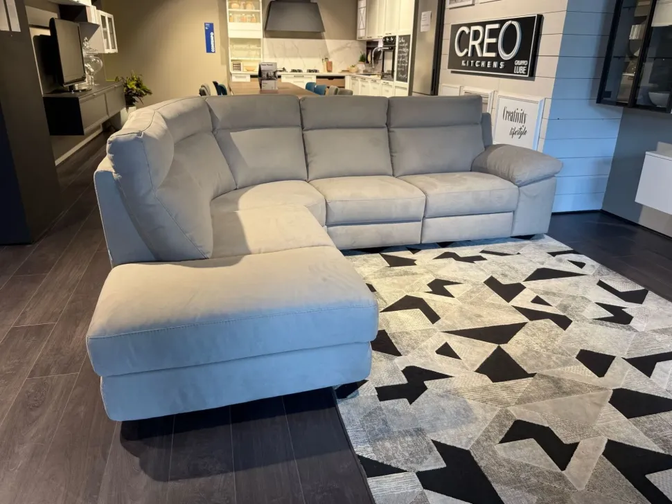 Non perdere lo sconto sul divano angolare Calia modello Taylor SX con divano laterale DX. Dotato di relax elettrico e rivestito in tessuto Mario 604 Taupe.